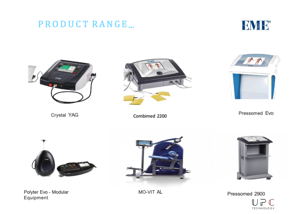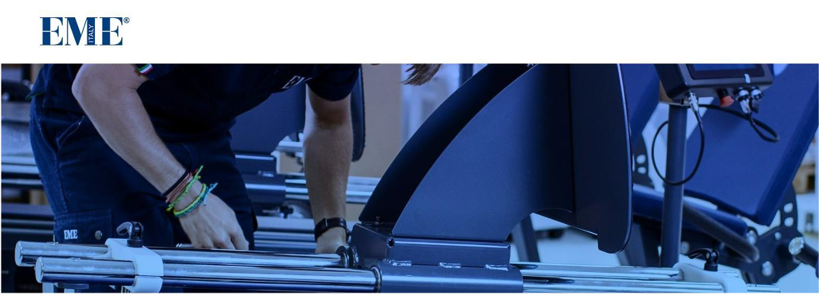 Established in 1983, EME strengthened its brand on an international level, as a Leading company in the Production of electro medical equipment for physiotherapy, aesthetics and aesthetic medicine.Over time, EME was ableto wisely merge the experience of professionals in the field, producing cutting-edge technologies, as a result of an in-depth study of new trends of applied therapy, always combined with a modern design.Today, the reliability of EME products is globally recognized and, thanks to the fruitful collaboration with our Italian and foreign partners, EME successfully distributes its products, all certified as “Made in Italy“,